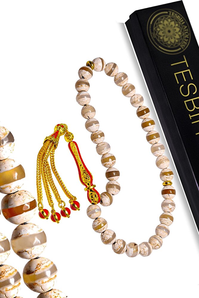 Ürün ya da Doğal Taş Açıklaması (Para, Bereket ve Pozitif Enerji Taşı) Akik tesbih modelleri, ''Tesbih Atölyesi'' Atölyelerinde ustalarımız tarafından kuru torna işciliği ile elde özen ile tane tane işlenmektedir. Ürünlerimiz el işciliği olduğu için sınırlı sayıda üretilmektedir. Tasarımlarımızda kullandığımız taşlar Dünya'nın en kaliteli akik taşlarını kullanmaktayız. Tasarımlarımızda kullandığımız doğal taşların hiç biri birbirinin aynısı olmadığı için küçükte olsa farklılık gösterebilir. Vücudunuza temas ettiği anda negatif enerjilerinizi alır ve pozitif enerjiler verir. Yedek ipi gönderilir ve ürünlerimiz ''Tesbih Atölyesi'' koruyucu ağaç kutusu ile gönderilmektedir. Bu tasarımda; Beyaz çizgili doğal tibet akik taşı ve sarı kırmızı mineli altın kaplama telkari imame ve püskül seti kullanılmıştır. Çift kaplama atılıdığı için renk atmaz ve kararmaz bir yapıya sahiptir. Üretildiği Taş; Akik Taşı; Ana Renk; Doğal Renk; Ağırlık; 20-30 gr; Tane Şekli; 8x8 mm; Tane Ölçüsü; Küre Kesim; Toplam Uzunluk; 20-30cm; İmame ve Püskül Maddesi; Düşük Ayar Gümüş;