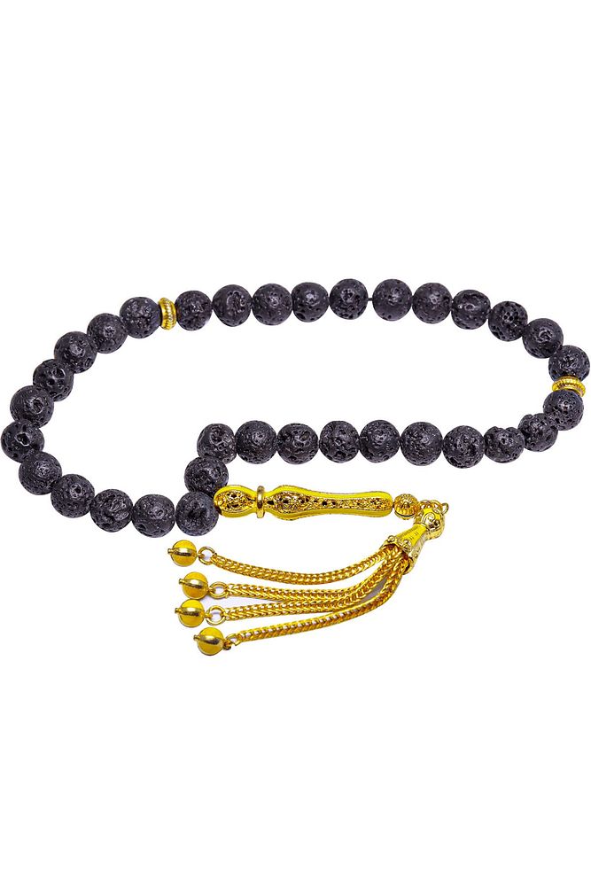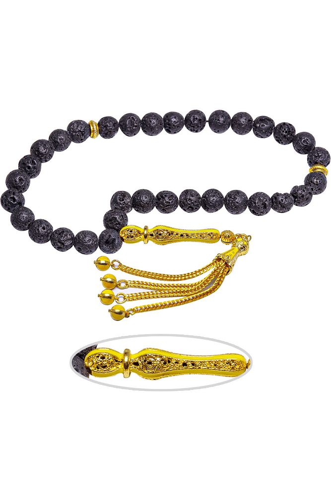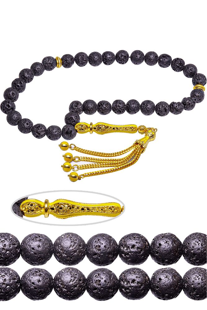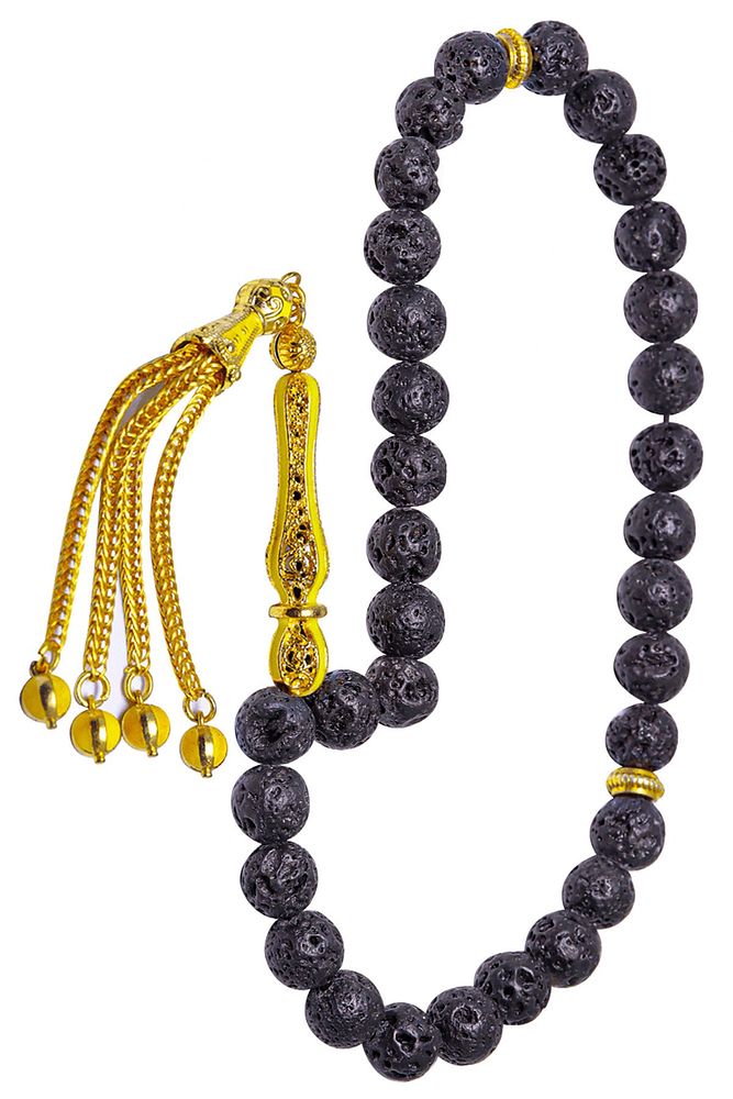Ürün ya da Doğal Taş Açıklaması (Volkanik Enerji Yanardağ Taşı) Lav taşı tesbih modelleri, ''Tesbih Atölyesi'' Atölyelerinde ustalarımız tarafından kuru torna işciliği ile elde özen ile tane tane işlenmektedir. Ürünlerimiz el işciliği olduğu için sınırlı sayıda üretilmektedir. Tasarımlarımızda kullandığımız taşlar Dünya'nın en kaliteli doğal taşlarını ithal etmekteyiz. Tasarımlarımızda kullandığımız doğal taşların hiç biri birbirinin aynısı olmadığı için küçükte olsa farklılık gösterebilir. Yanardağların patlaması sonucu elde edilen lav taşlarından üretilmektedir. Bu tasarımda; Siyah renkli doğal volkanik yanardağ tüfü lav taşı ve Sarı renkli sarı mineli 24 ayar altın kaplama imame ve püskül seti kullanılmıştır. Çift kaplama atıldığı için renk atmaz ve kararmaz bir yapıya sahiptir. Yedek ip ile gönderim sağlanır. Üretildiği Taş; Lav Taşı; Ana Renk; Doğal Renk; Ağırlık; 20-30 gr; Tane Şekli; 8x8 mm; Tane Ölçüsü; Küre Kesim; Toplam Uzunluk; 20-30 cm; İmame ve Püskül Maddesi; Düşük Ayar Gümüş;