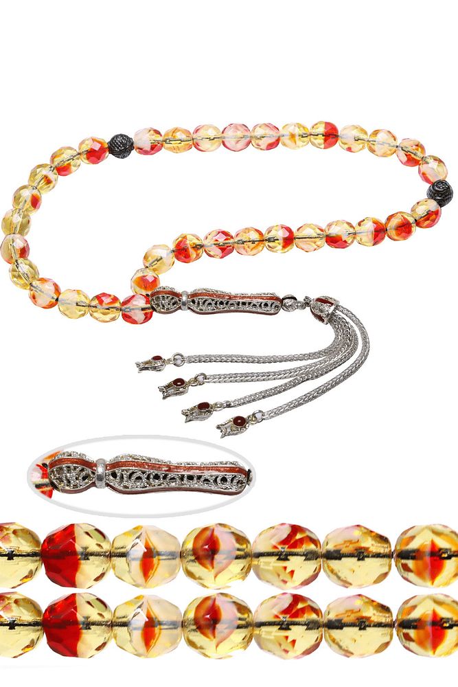 Ürün ya da Doğal Taş Açıklaması (Para – Sağlık – Pozitif Enerji Taşı) Kuvars tesbih modelleri, ”Tesbih Atölyesi” Atölyelerinde ustalarımız tarafından kuru torna işciliği ile elde özen ile tane tane işlenmektedir. Ürünlerimiz el işciliği olduğu için sınırlı sayıda üretilmektedir. Tasarımlarımızda kullandığımız taşlar Dünya’nın en kaliteli doğal taşlarını kullanmaktayız. Tasarımlarımızda kullandığımız doğal taşların hiç biri birbirinin aynısı olmadığı için küçükte olsa farklılık gösterebilir. Doğal taşlar vücudunuza temas ettiği anda negatif enerjilerinizi alır ve pozitif enerjiler verir. Bu tasarımda; Sarı kırmızı renkli doğal fasetli kuvars taşı ve Beyaz bakır mineli 24 ayar beyaz altın kaplama imame ve püskül seti kullanılmıştır. Çift kaplama atıldığı için renk atmaz ve kararmaz bir yapıya sahiptir. Yedek ip ile gönderim sağlanır. Üretildiği Taş; Kuvars; Ana Renk; Doğal Renk; Ağırlık; 20-30 gr; Tane Şekli; 8×8 mm; Tane Ölçüsü; Küre Kesim; Toplam Uzunluk; 20-30 cm; İmame ve Püskül Maddesi; Düşük Ayar Gümüş;