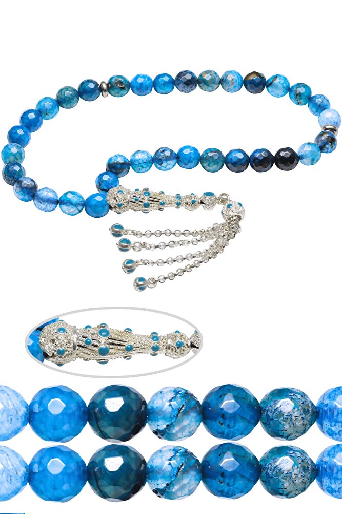Ürün ya da Doğal Taş Açıklaması (Negatif Enerji İtici Pozitif Enerji Taşı) Azurit taşı tesbih modelleri, ''Tesbih Atölyesi'' Atölyelerinde ustalarımız tarafından kuru torna işciliği ile elde özen ile tane tane işlenmektedir. Ürünlerimiz el işciliği olduğu için sınırlı sayıda üretilmektedir. Tasarımlarımızda kullandığımız taşlar Dünya'nın en kaliteli doğal taşlarını ithal etmekteyiz. Tasarımlarımızda kullandığımız doğal taşların hiç biri birbirinin aynısı olmadığı için küçükte olsa farklılık gösterebilir. Baş ağrınızı sinirinizi ve stresinizi ortadan kaldıracak içsel huzur verecektir. Bu tasarımda; Mavi renkli üzeri koruyucu boya kaplamalı doğal azurit taşı ve Beyaz turkuaz mineli 24 ayar beyaz altın kaplama imame ve püskül seti kullanılmıştır. Çift kaplama atıldığı için renk atmaz ve kararmaz bir yapıya sahiptir. Yedek ip ile gönderim sağlanır. Üretildiği Taş; Azurit Taşı; Ana Renk; Doğal Renk; Ağırlık; 20-30 gr; Tane Şekli; 8x8 mm; Tane Ölçüsü; Küre Kesim; Toplam Uzunluk; 20-30 cm; İmame ve Püskül Maddesi; Düşük Ayar Gümüş;
