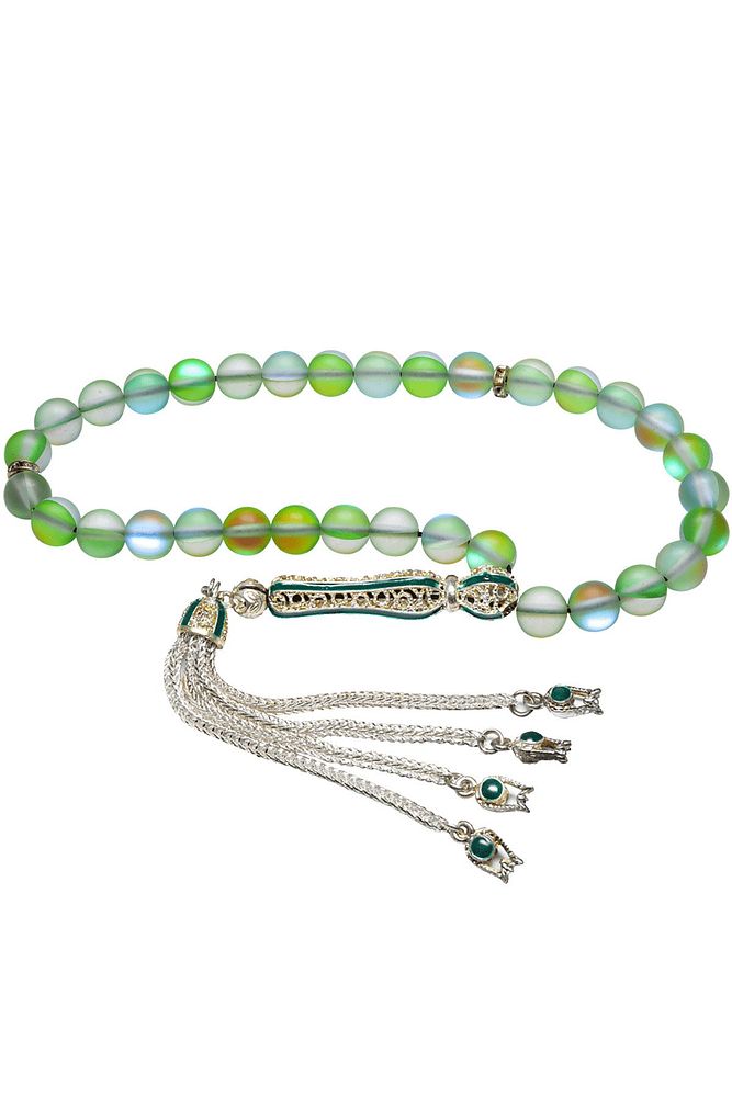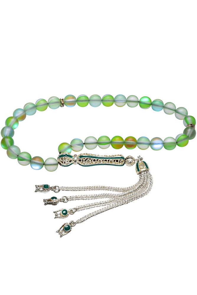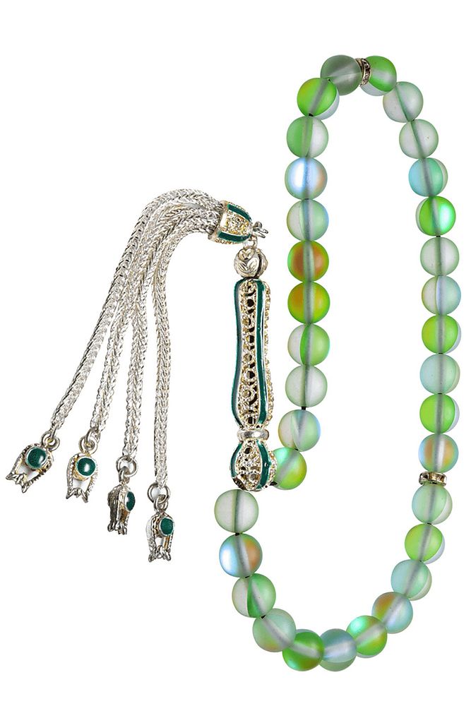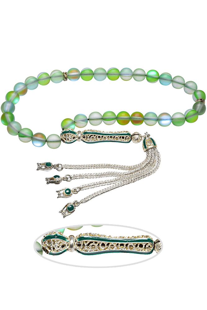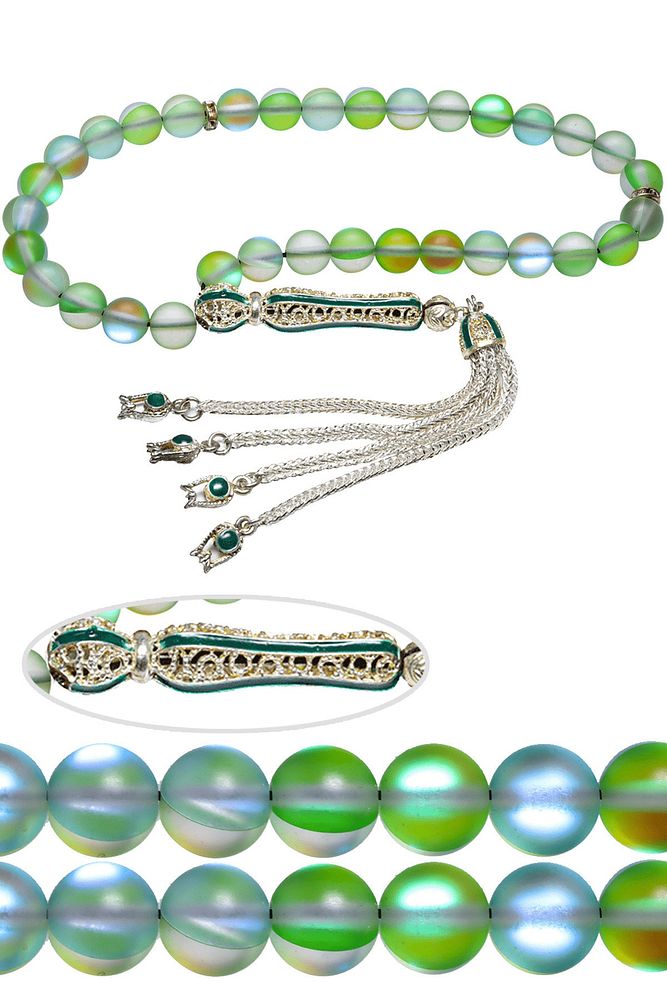 Ürün ya da Doğal Taş Açıklaması (Para - Sağlık - Pozitif Enerji Taşı) Kuvars tesbih modelleri, ''Tesbih Atölyesi'' Atölyelerinde ustalarımız tarafından kuru torna işciliği ile elde özen ile tane tane işlenmektedir. Ürünlerimiz el işciliği olduğu için sınırlı sayıda üretilmektedir. Tasarımlarımızda kullandığımız taşlar Dünya'nın en kaliteli doğal taşlarını kullanmaktayız. Tasarımlarımızda kullandığımız doğal taşların hiç biri birbirinin aynısı olmadığı için küçükte olsa farklılık gösterebilir. Doğal taşlar vücudunuza temas ettiği anda negatif enerjilerinizi alır ve pozitif enerjiler verir. Bu tasarımda; Yeşil renkli termal kuvars taşı ve Beyaz siyah mineli 24 ayar beyaz altın kaplama imame ve püskül seti kullanılmıştır. Çift kaplama atıldığı için renk atmaz ve kararmaz bir yapıya sahiptir. Yedek ip ile gönderim sağlanır. Üretildiği Taş; Kuvars; Ana Renk; Doğal Renk; Ağırlık; 20-30 gr; Tane Şekli; 8x8 mm; Tane Ölçüsü; Küre Kesim; Toplam Uzunluk; 20-30cm; İmame ve Püskül Maddesi; Nikel Alaşımlı;