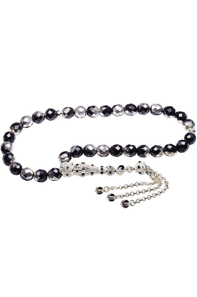 Sertifikalı Telkari Püskül Siyah Beyaz Doğal Hematit Taşı Tesbih