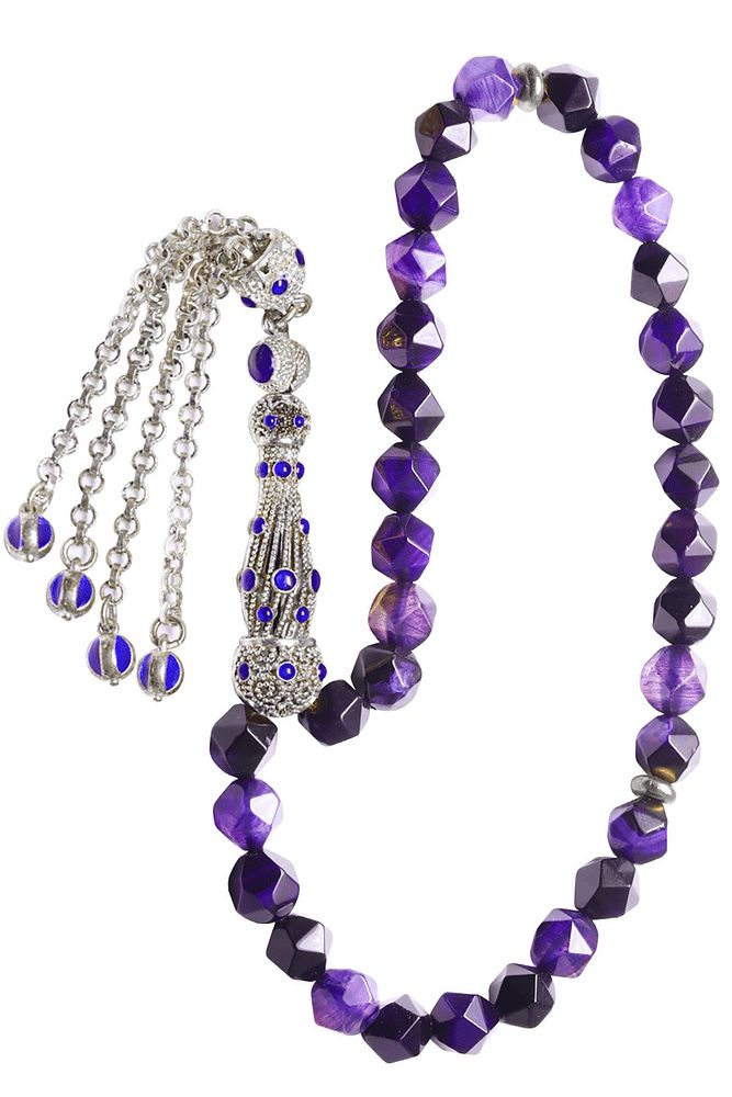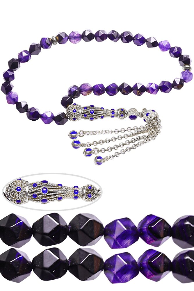 Ürün ya da Doğal Taş Açıklaması (Aşk ve Sevgi Taşı) Ametist tesbih modelleri, \'\'Tesbih Atölyesi\'\' Atölyelerinde ustalarımız tarafından kuru torna işciliği ile elde özen ile tane tane işlenmektedir. Ürünlerimiz el işciliği olduğu için sınırlı sayıda üretilmektedir. Tasarımlarımızda kullandığımız taşlar Dünya\'nın en kaliteli ametist taşlarını kullanmaktayız. Tasarımlarımızda kullandığımız doğal taşların hiç biri birbirinin aynısı olmadığı için küçükte olsa farklılık gösterebilir. Vücudunuza temas ettiği anda sizleri gevşetir sinirinizi ve stresinizi alır. Pozitif enerjiler verir. Yedek ipi gönderilir ve ürünlerimiz \'\'Tesbih Atölyesi\'\' koruyucu ağaç kutusu ile gönderilmektedir. Bu tasarımın yapımında; Elmas kesim doğal ametist taşı kullanılmıştır. İmame ve püskül tasarımında; Beyaz mavi mineli altın kaplama telkari imame ve püskül seti kullanılmıştır. Çift kaplama atıldığı için renk atmaz ve kararmaz bir yapıya sahiptir. Üretildiği Taş; Ametist Taşı; Ana Renk; Doğal Renk; Ağırlık; 20-30 gr; Tane Şekli; 7x8 mm; Tane Ölçüsü; Elmas Kesim; Toplam Uzunluk; 20-30 cm; İmame ve Püskül Maddesi; Düşük Ayar Gümüş;