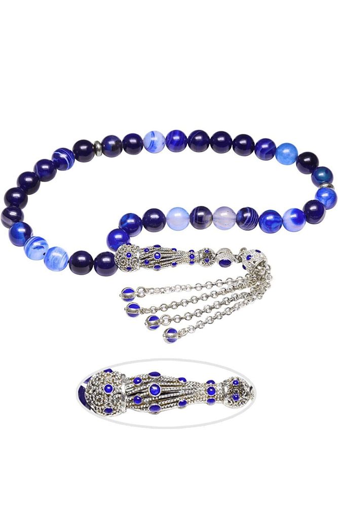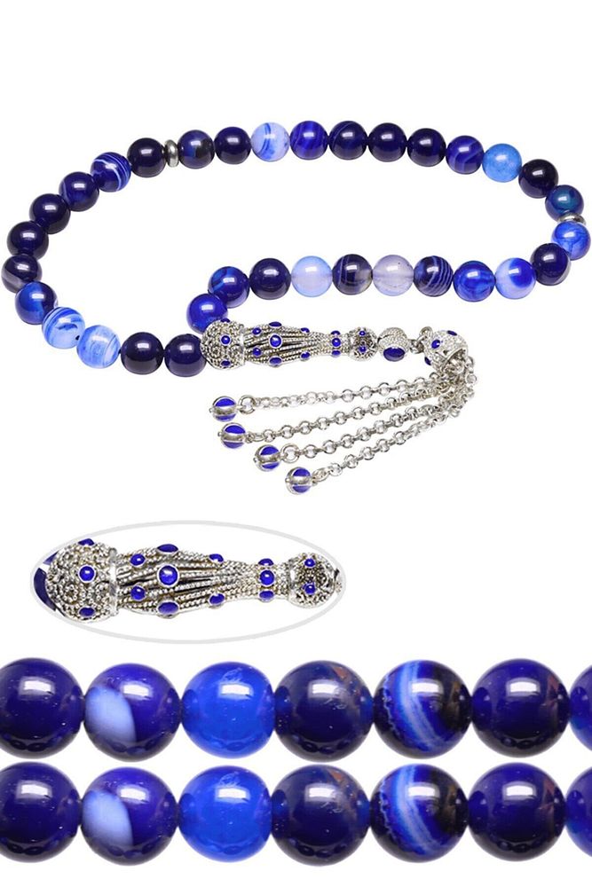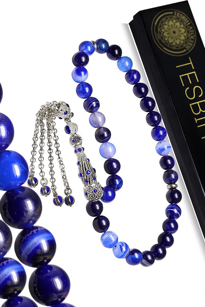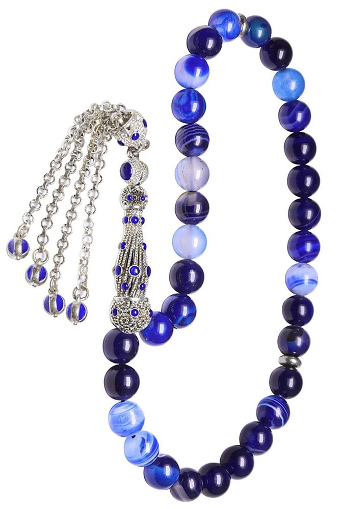 Sertifikalı Telkari Püsküllü Doğal Parlak Mavi Akik Taşı Tesbih