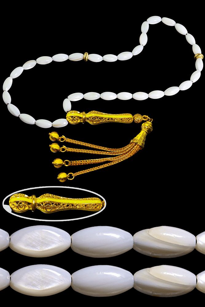 (Kalsiyum ve Zeka Taşı) Sedef tesbih modelleri, ''Tesbih Atölyesi'' Atölyelerinde usta ellerde üretilmektedir. Tasarımlarımızda Dünya'nın en kaliteli doğal taşlarını kullanmaktayız. Ürünlerimiz el işciliği olduğu için sınırlı sayıda üretilmektedir. Tasarımlarımızda kullandığımız doğal taşların hiç biri birbirinin aynısı olmadığı için küçükte olsa farklılık gösterebilir. Sedef taşı, midye, istiridye gibi deniz canlılarının kabuğundan elde edilmektedir. Pozitif enerjiler verir. Mineral açısından da oldukça zengindir. Bu tasarımda; Doğal Sedef taşı kullanılmıştır. Sarı renkli sarı mineli 24 ayar altın kaplama imame ve püskül seti kullanılmıştır. Çift kaplama atıldığı için renk atmaz ve kararmaz bir yapıya sahiptir. Yedek ip ile gönderim sağlanır. Üretildiği Taş ; Sedef ; Ana Renk ; Doğal Renk ; Ağırlık ; 20-30 gr ; Tane Şekli ; 6x9 mm ; Tane Ölçüsü ; Arpa Kesim ; Toplam Uzunluk ; 20-30 ; İmame ve Püskül Maddesi ; Düşük Ayar Gümüş ;