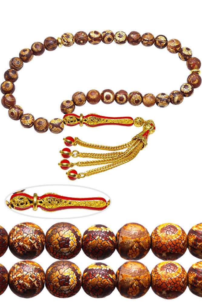 Ürün ya da Doğal Taş Açıklaması (Para, Bereket ve Pozitif Enerji Taşı) Akik tesbih modelleri, \'\'Tesbih Atölyesi\'\' Atölyelerinde ustalarımız tarafından kuru torna işciliği ile elde özen ile tane tane işlenmektedir. Ürünlerimiz el işciliği olduğu için sınırlı sayıda üretilmektedir. Tasarımlarımızda kullandığımız taşlar Dünya\'nın en kaliteli akik taşlarını kullanmaktayız. Tasarımlarımızda kullandığımız doğal taşların hiç biri birbirinin aynısı olmadığı için küçükte olsa farklılık gösterebilir. Vücudunuza temas ettiği anda negatif enerjilerinizi alır ve pozitif enerjiler verir. Yedek ipi gönderilir ve ürünlerimiz \'\'Tesbih Atölyesi\'\' koruyucu ağaç kutusu ile gönderilmektedir. Bu tasarımda; Kahverengi benekli doğal tibet akik taşı ve altın kaplama kırmızı mineli telkari imame ve püskül seti kullanılmıştır. Çift kaplama atılıdığı için renk atmaz ve kararmaz bir yapıya sahiptir. Üretildiği Taş; Akik Taşı; Ana Renk; Doğal Renk; Ağırlık; 20-30 gr; Tane Şekli; 8x8 mm; Tane Ölçüsü; Küre Kesim; Toplam Uzunluk; 20-30cm; İmame ve Püskül Maddesi; Düşük Ayar Gümüş;