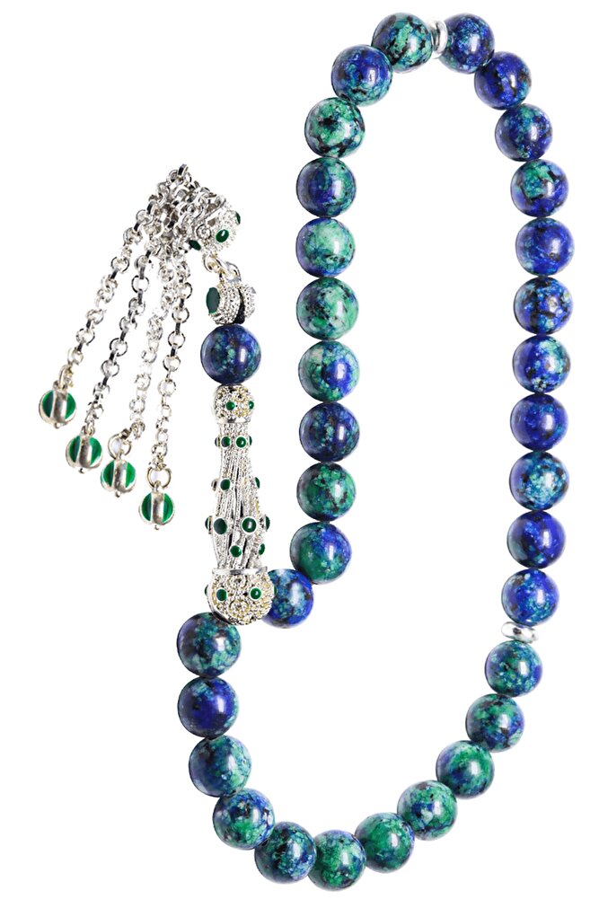 (Pozitif Enerji, Bereket ve Nazar Taşı); ; Jade yeşim taşı tesbih modelleri, \'\'Tesbih Atölyesi\'\' Atölyelerinde usta ellerde üretilmektedir. Tasarımlarımızda Dünya\'nın en kaliteli doğal taşlarını kullanmaktayız. Ürünlerimiz el işciliği olduğu için sınırlı sayıda üretilmektedir. Tasarımlarımızda kullandığımız doğal taşların hiç biri birbirinin aynısı olmadığı için küçükte olsa farklılık gösterebilir. ; ; Bu tasarımda; Mavi ve yeşil renkli doğal jade yeşim taşı kullanılmıştır. Beyaz turkuaz mineli 24 ayar altın kaplama imame ve püskül seti kullanılmıştır. Çift kaplama atıldığı için renk atmaz ve kararmaz bir yapıya sahiptir. Yedek ip ile gönderim sağlanır. ; Üretildiği Taş; Yeşim Taşı; Ana Renk; Doğal Renk; Ağırlık; 20-30 gr; Tane Şekli; 8x8 mm; Tane Ölçüsü; Küre Kesim; Toplam Uzunluk; 20-30 cm; İmame ve Püskül Maddesi; Düşük Ayar Gümüş;