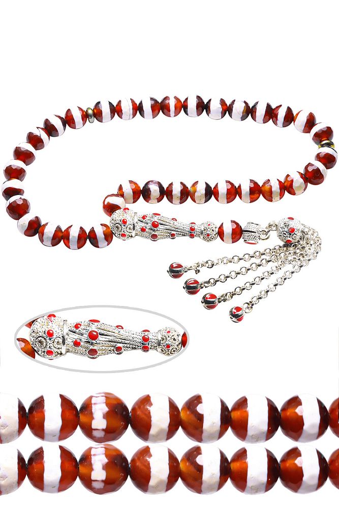 Sertifikalı Telkari Püsküllü Kırmızı Çizgili Doğal Akik Taşı Tesbih