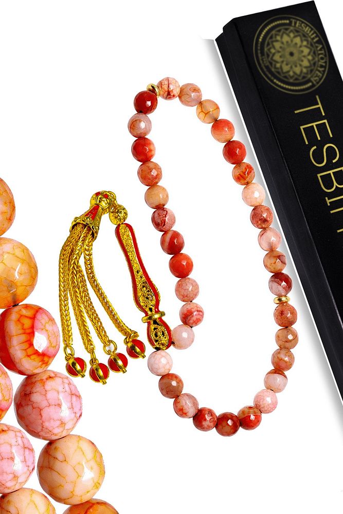 (Para, Bereket ve Pozitif Enerji Taşı) Akik tesbih modelleri, ''Tesbih Atölyesi'' Atölyelerinde ustalarımız tarafından kuru torna işciliği ile elde özen ile tane tane işlenmektedir. Ürünlerimiz el işciliği olduğu için sınırlı sayıda üretilmektedir. Tasarımlarımızda kullandığımız taşlar Dünya'nın en kaliteli akik taşlarını kullanmaktayız. Tasarımlarımızda kullandığımız doğal taşların hiç biri birbirinin aynısı olmadığı için küçükte olsa farklılık gösterebilir. Vücudunuza temas ettiği anda negatif enerjilerinizi alır ve pozitif enerjiler verir. Yedek ipi gönderilir ve ürünlerimiz ''Tesbih Atölyesi'' koruyucu ağaç kutusu ile gönderilmektedir. Bu tasarımın yapımında; Fasetli doğal turuncu akik taşı kullanılmıştır. İmame ve püskül tasarımında; Sarı mineli kırmızı altın kaplama telkari imame ve püskül seti kullanılmıştır. Çift kaplama atıldığı için renk atmaz ve kararmaz bir yapıya sahiptir. Üretildiği Taş; Akik Taşı; Ana Renk; Doğal Renk; Ağırlık; 20-30 gr; Tane Şekli; 8x8 mm; Tane Ölçüsü; Küre Kesim; Toplam Uzunluk; 20-30 cm; İmame ve Püskül Maddesi; Düşük Ayar Gümüş;