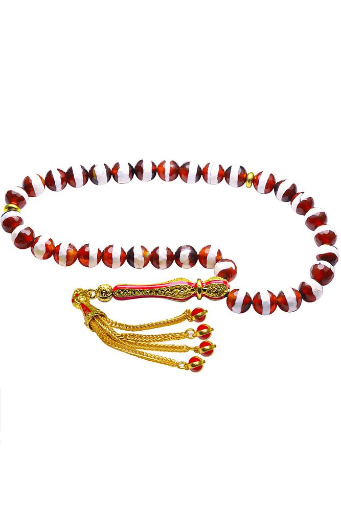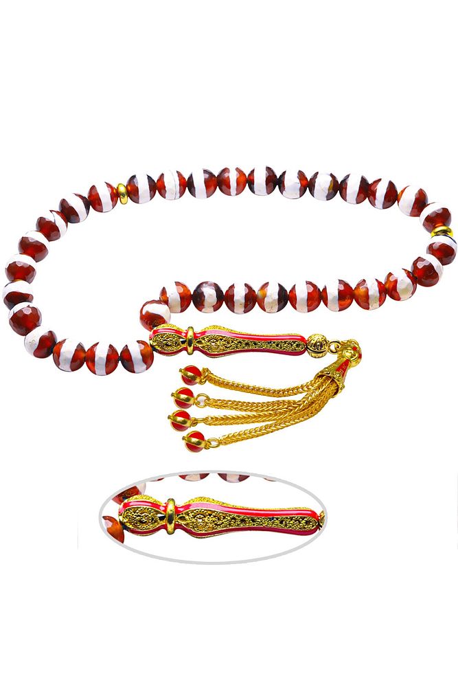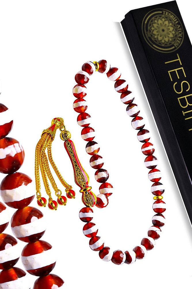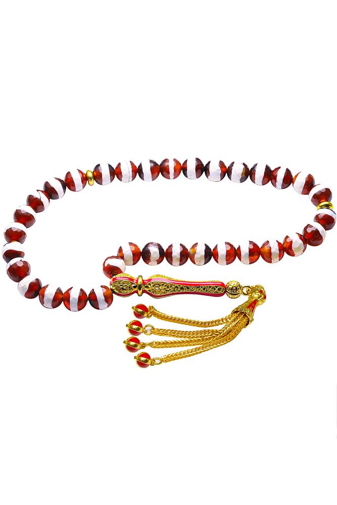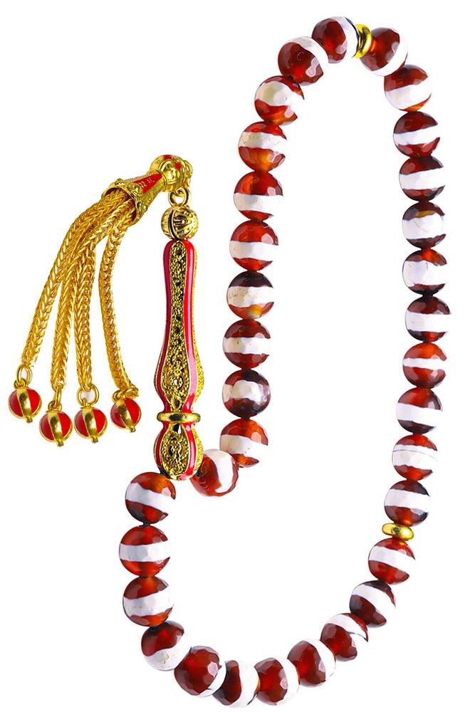 Ürün ya da Doğal Taş Açıklaması; ; (Para, Bereket ve Pozitif Enerji Taşı); ; Akik tesbih modelleri, ''Tesbih Atölyesi'' Atölyelerinde ustalarımız tarafından kuru torna işciliği ile elde özen ile tane tane işlenmektedir. Ürünlerimiz el işciliği olduğu için sınırlı sayıda üretilmektedir. Tasarımlarımızda kullandığımız taşlar Dünya'nın en kaliteli akik taşlarını kullanmaktayız. Tasarımlarımızda kullandığımız doğal taşların hiç biri birbirinin aynısı olmadığı için küçükte olsa farklılık gösterebilir. Vücudunuza temas ettiği anda negatif enerjilerinizi alır ve pozitif enerjiler verir. Yedek ipi gönderilir ve ürünlerimiz ''Tesbih Atölyesi'' koruyucu ağaç kutusu ile gönderilmektedir. ; ; Bu tasarımda; Kırmızı beyaz çizgili doğal tibet akik taşı ve sarı kırmızı mineli altın kaplama telkari imame ve püskül seti kullanılmıştır. Çift kaplama atılıdığı için renk atmaz ve kararmaz bir yapıya sahiptir. ; ; Üretildiği Taş; Akik Taşı; Ana Renk; Doğal Renk; Ağırlık; 20-30 gr; Tane Şekli; 8x8 mm; Tane Ölçüsü; Küre Kesim; Toplam Uzunluk; 20-30cm; İmame ve Püskül Maddesi; Düşük Ayar Gümüş;
