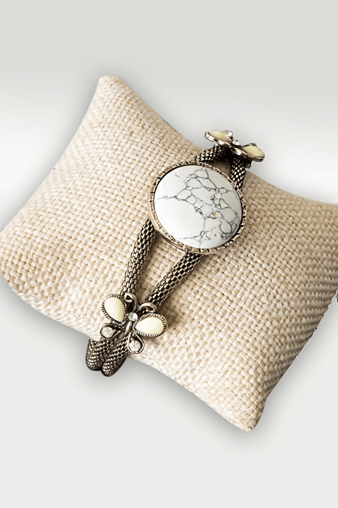 Bu Üründe Kullanılan Doğal Taş: Havlit Taşı Telkari Model Bu Üründe Kullanılan Taş Boyutu 2.5x2.5 cm Ağırlık 20 gr Bilek ölçüsü;16+6(ara aparat uzatmalı) cm Ayarlamalıdır yapıda olduğu için yetişkin kadın ve erkekler için uygundur. Not: Ürünler doğal taş olduğu için renk tonları küçük farklılıklar gösterebilir.