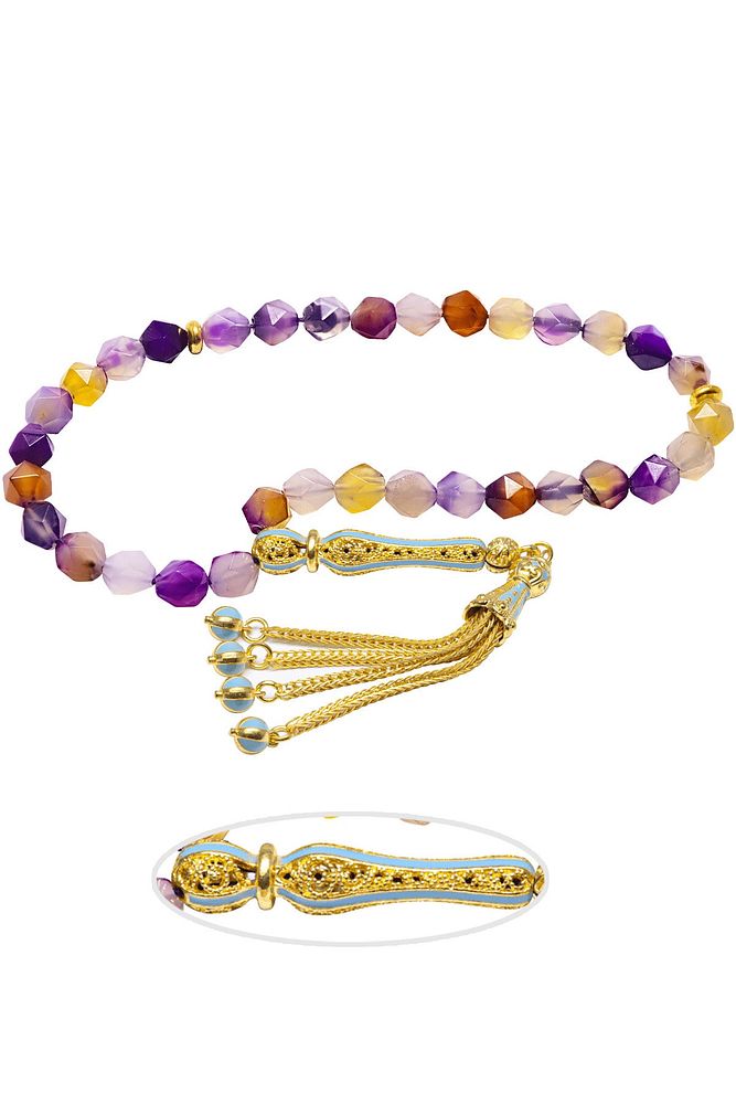 Sertifikalı Turkuaz Mineli Telkari Püskül Fasetli Doğal Ametist Taşı Tesbih
