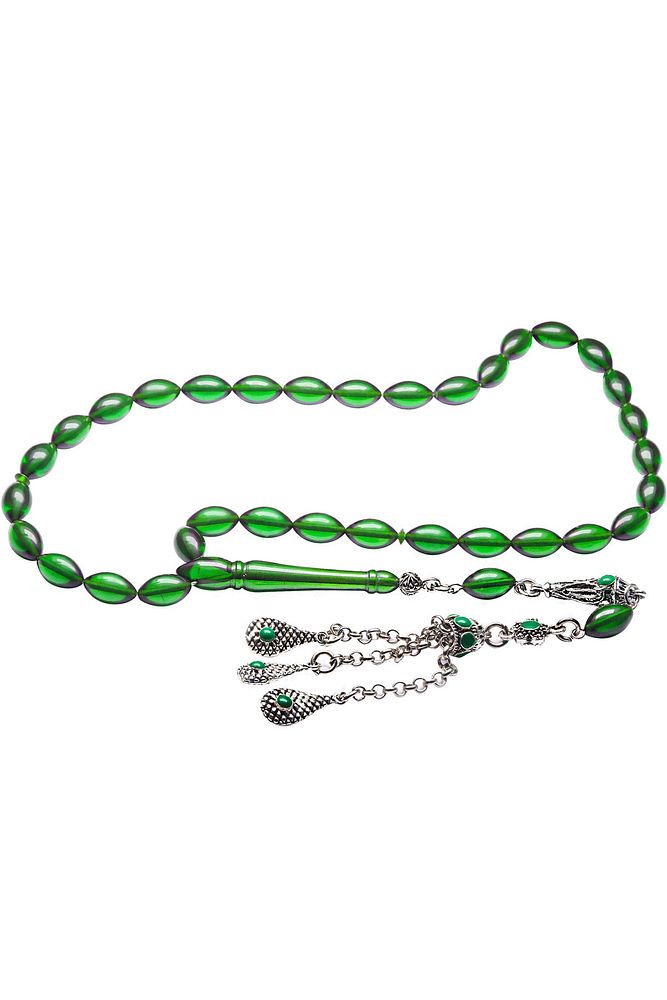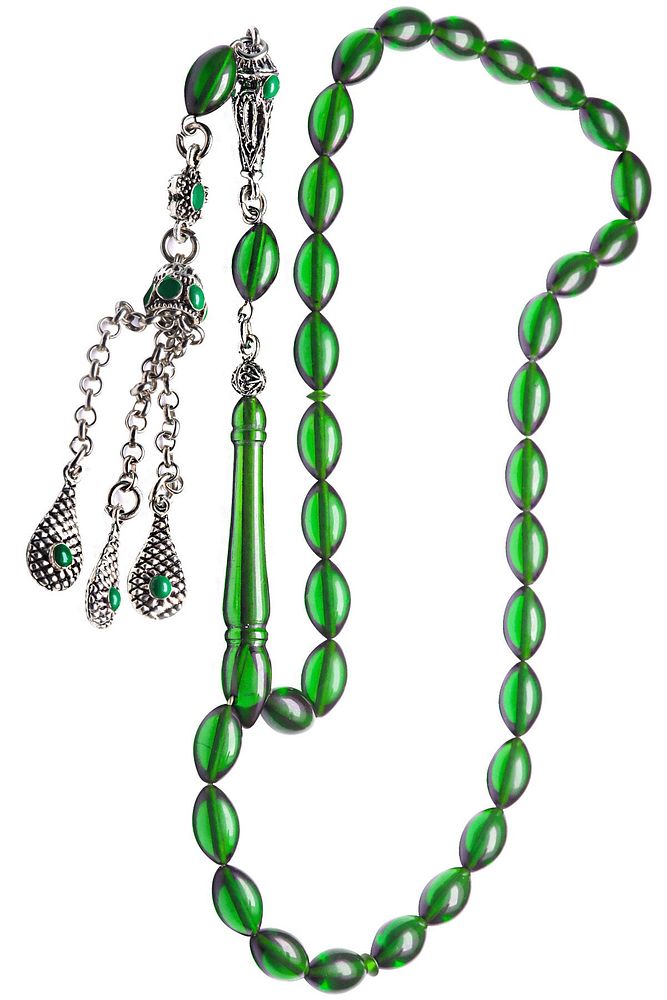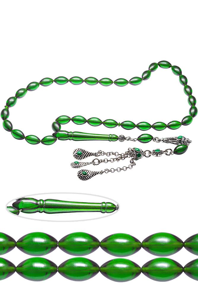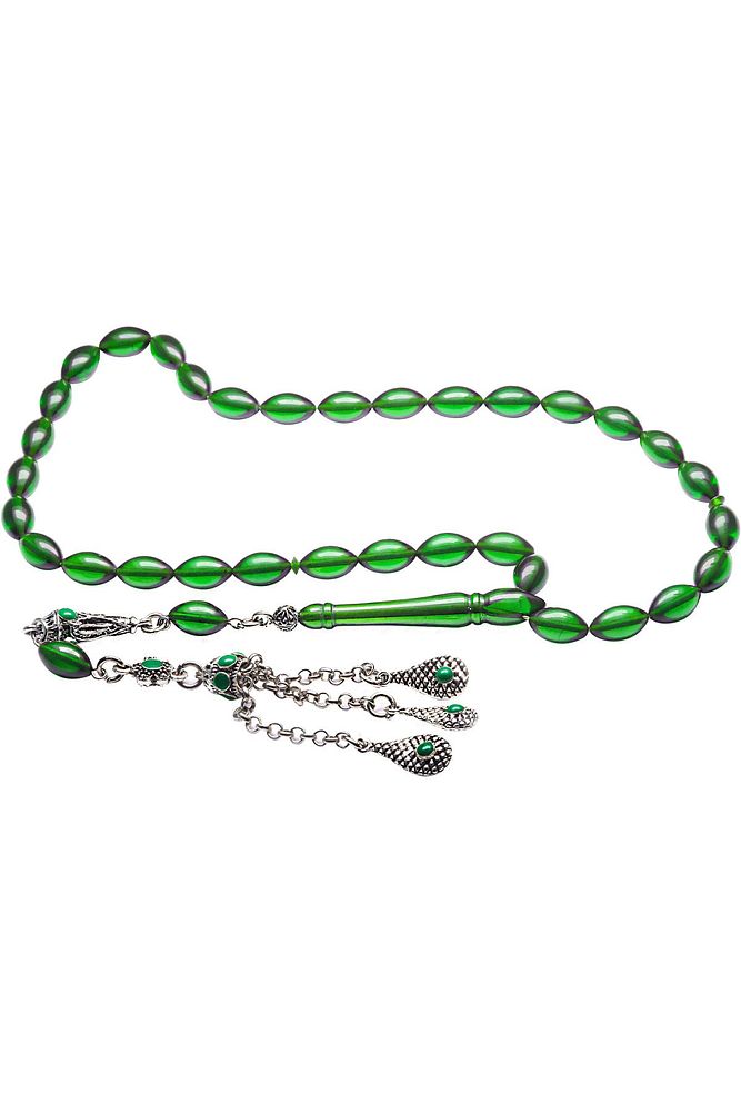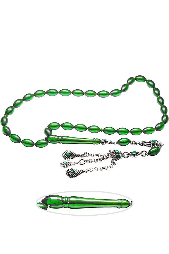 Bu tasarımda; Şeffaf transparan yeşil özel renk alan ve koku veren kaliteli ateş kehribar reçine kullanılmıştır. Her kehribar tanesi birbirinin aynısı olmadığı için küçükte olsa farklılıklar gösterebilir. Üretildiği Malzeme ; Ateş Kehribar ; Ana Renk ; Şeffaf Yeşil Renk ; Ağırlık ; 20-30 gr ; Tane Şekli ; 7x11 mm ; Tane Ölçüsü ; Arpa Kesim ; Toplam Uzunluk ; 20-30 cm ; İmame ve Püskül Maddesi ; Düşük Ayar Gümüş ;