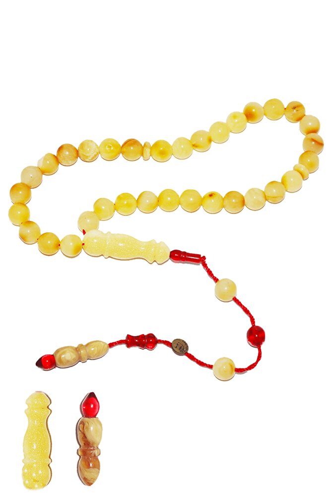Bu tasarımda; Günlük çekim küre kesim mat ukrayna %100 doğal damla kehribar taşı kullanılmıştır. Püskül yapımında; Kırmızı geçişli kısımlar blok zardır. Sıralı sistem kullanılmıştır. ; Üretildiği Taş ; Kehribar Taşı ; Renk ; Doğal Renk ; Ağırlık ; 8.8 gr ; Tane Şekli ; 6.7x6.7 mm ; Tane Ölçüsü ; Küre Kesim ; Toplam Uzunluk ; 20-30 cm ; Püskül Maddesi ; Sistemli ;
