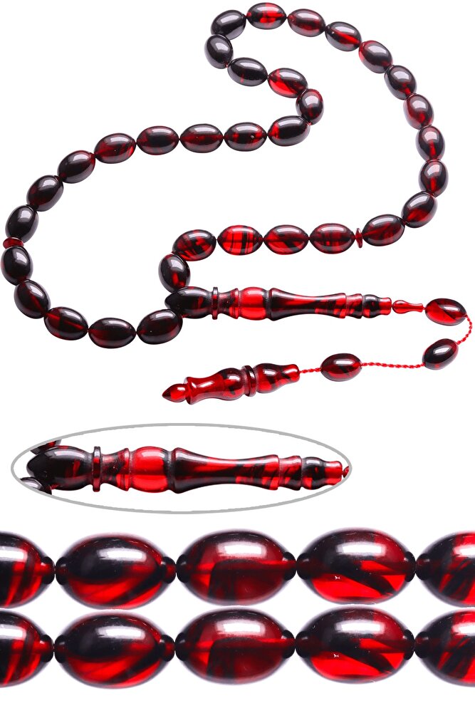 Ürün ya da Doğal Taş Açıklaması; ; (Ağrı Kesici, Sinir Stres ve Bereket Taşı); ; Ateş kehribar tesbih modelleri, ''Tesbih Atölyesi'' Atölyelerinde ustalarımız tarafından kuru torna işciliği ile elde özen ile tane tane işlenmektedir. Ürünlerimiz el işciliği olduğu için sınırlı sayıda üretilmektedir. Tasarımlarımızda kullandığımız reçineler Dünya'nın en kaliteli reçineleridir. Kısa bir süre içerisinde renk alır ve koku verir. Ürünleriniz orijinallik ve garanti belgesi ile gönderilir. Tasarımlarımıza üç kat cila atılmıştır. Muhteşem bir çekime sahip koleksiyonluk ve günlük çekim için ideal ürünlerdir.; ; Bu tasarımda; Siyah kırmızı renkli özel hareli 1.sınıf işlemeli özel renk alan ve koku veren kaliteli ateş kehribar reçine kullanılmıştır. Her kehribar tanesi birbirinin aynısı olmadığı için küçükte olsa farklılıklar gösterebilir.; ; Üretildiği Malzeme; Ateş Kehribar; Ana Renk; Siyah Kırmızı Renk; Ağırlık; 20-30 gr; Tane Şekli; 7.5x11.5 mm; Tane Ölçüsü; Beyzi Kesim; Toplam Uzunluk; 20-30 cm; İmame ve Püskül Maddesi; Sistemli;
