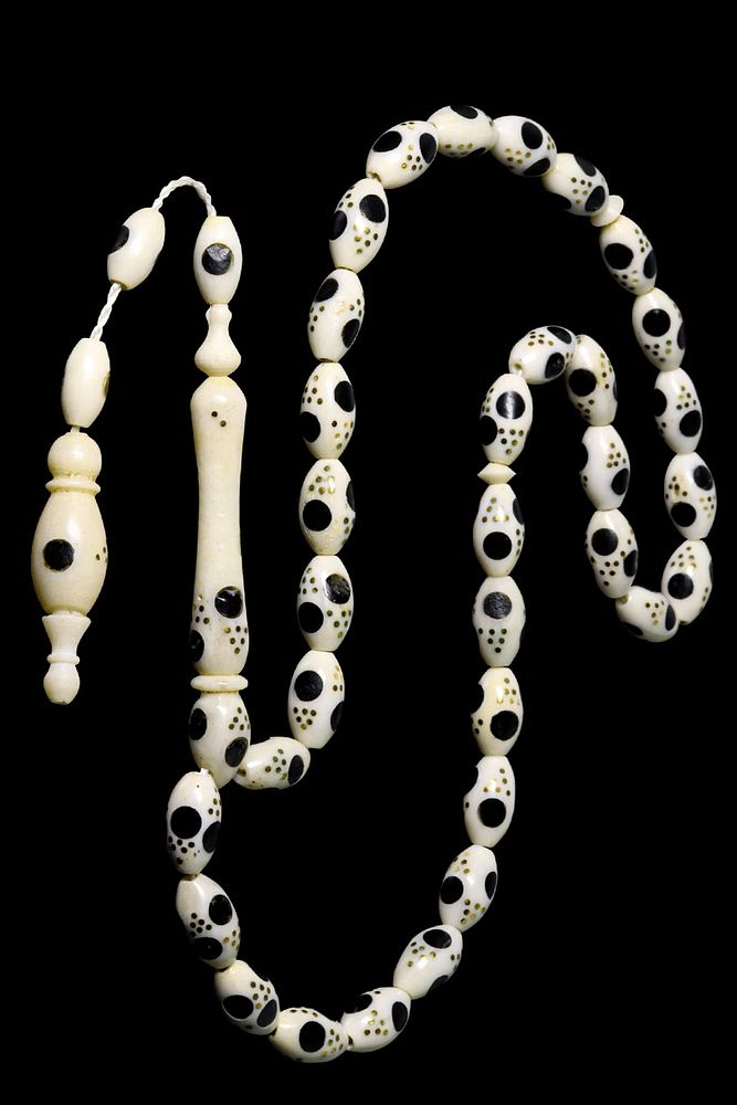 Sistemli Beyzi Kesim Siyah Mineli Pirinç Işlemeli Deve Kemiği Tesbih