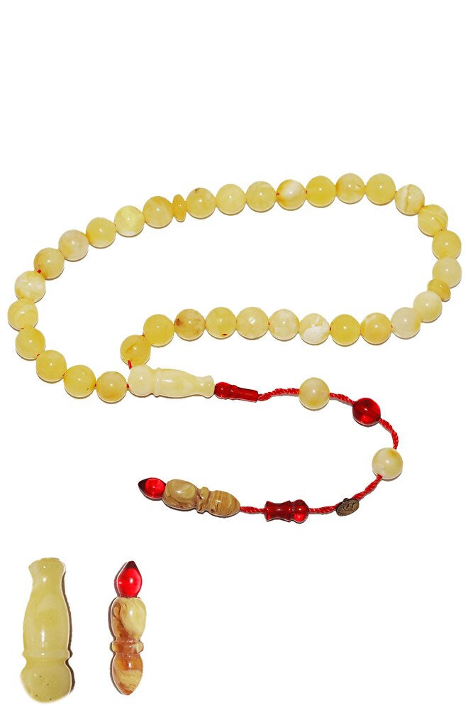 Ürün ya da Doğal Taş Açıklaması (Doğal Sakinleştirici, Astım, Guatr ve Ağrı Kesici Taşı) Doğal damla kehribar tesbih modelleri, ''Tesbih Atölyesi'' Atölyelerinde ustalarımız tarafından kuru torna işciliği ile elde özen ile tane tane işlenmektedir. Ürünlerimiz el işciliği olduğu için sınırlı sayıda üretilmektedir. Üzerine üç kat el cilası atılmıştır. Kehribar çam ağacının fosilleşmiş reçinesidir. Baltık ülkelerinden en kaliteli kehribar kütlelerini ithal etmekteyiz. Damla kehribar tesbih Buram buram çam kokulu ürünlerimiz %100 doğal, garantili ve sertifikalıdır. Ürünlerimiz fabrikasyon olmadığı için kehribar tanelerinin hiç biri birbirinin aynısı olmadığı için küçükte olsa farklılıklar olabilir. Bu tasarımda; Günlük çekim küre kesim mat ukrayna %100 doğal damla kehribar taşı kullanılmıştır. Püskül yapımında; Kırmızı geçişli kısımlar blok zardır. Sıralı sistem kullanılmıştır. Üretildiği Taş; Kehribar Taşı; Renk; Doğal Renk; Ağırlık; 8.4 gr; Tane Şekli; 6.8x6.8 mm; Tane Ölçüsü; Küre Kesim; Toplam Uzunluk; 20-30 cm; Püskül Maddesi; Sistemli;
