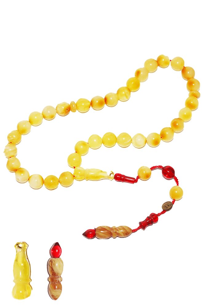 Ürün ya da Doğal Taş Açıklaması (Doğal Sakinleştirici, Astım, Guatr ve Ağrı Kesici Taşı) Doğal damla kehribar tesbih modelleri, ''Tesbih Atölyesi'' Atölyelerinde ustalarımız tarafından kuru torna işciliği ile elde özen ile tane tane işlenmektedir. Ürünlerimiz el işciliği olduğu için sınırlı sayıda üretilmektedir. Üzerine üç kat el cilası atılmıştır. Kehribar çam ağacının fosilleşmiş reçinesidir. Baltık ülkelerinden en kaliteli kehribar kütlelerini ithal etmekteyiz. Damla kehribar tesbih Buram buram çam kokulu ürünlerimiz %100 doğal, garantili ve sertifikalıdır. Ürünlerimiz fabrikasyon olmadığı için kehribar tanelerinin hiç biri birbirinin aynısı olmadığı için küçükte olsa farklılıklar olabilir. Bu tasarımda; Günlük çekim küre kesim mat ukrayna %100 doğal damla kehribar taşı kullanılmıştır. Püskül yapımında; Kırmızı geçişli kısımlar blok zardır. Sıralı sistem kullanılmıştır. Üretildiği Taş; Kehribar Taşı; Renk; Doğal Renk; Ağırlık; 8.2 gr; Tane Şekli; 6.7x6.7 mm; Tane Ölçüsü; Küre Kesim; Toplam Uzunluk; 20-30 cm; Püskül Maddesi; Sistemli;