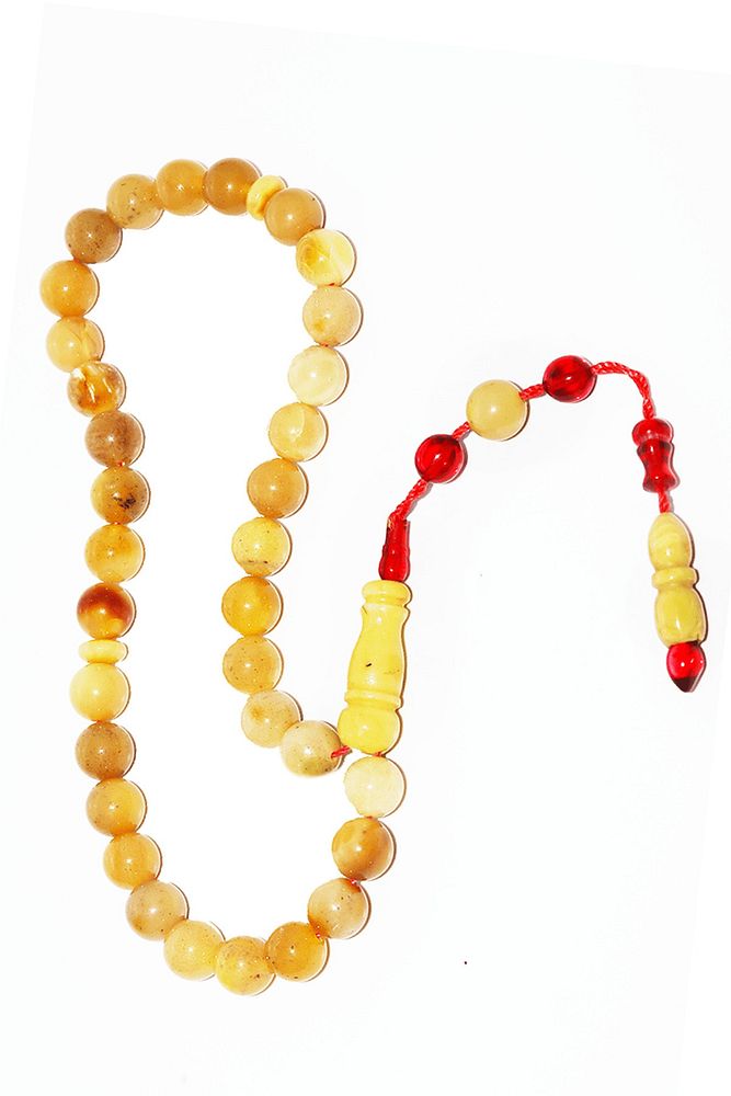 Ürün ya da Doğal Taş Açıklaması (Doğal Sakinleştirici, Astım, Guatr ve Ağrı Kesici Taşı) Doğal damla kehribar tesbih modelleri, ''Tesbih Atölyesi'' Atölyelerinde ustalarımız tarafından kuru torna işciliği ile elde özen ile tane tane işlenmektedir. Ürünlerimiz el işciliği olduğu için sınırlı sayıda üretilmektedir. Üzerine üç kat el cilası atılmıştır. Kehribar çam ağacının fosilleşmiş reçinesidir. Baltık ülkelerinden en kaliteli kehribar kütlelerini ithal etmekteyiz. Damla kehribar tesbih Buram buram çam kokulu ürünlerimiz %100 doğal, garantili ve sertifikalıdır. Ürünlerimiz fabrikasyon olmadığı için kehribar tanelerinin hiç biri birbirinin aynısı olmadığı için küçükte olsa farklılıklar olabilir. Bu tasarımda; Günlük çekim küre kesim mat ukrayna %100 doğal damla kehribar taşı kullanılmıştır. Püskül yapımında; Kırmızı geçişli kısımlar blok zardır. Sıralı sistem kullanılmıştır. Üretildiği Taş; Kehribar Taşı; Renk; Doğal Renk; Ağırlık; 11.6 gr; Tane Şekli; 7.7x7.7 mm; Tane Ölçüsü; Küre Kesim; Toplam Uzunluk; 20-30 cm; Püskül Maddesi; Sistemli;
