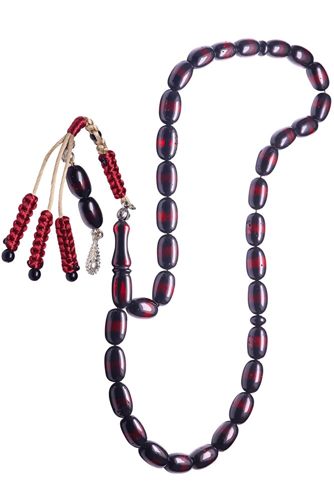 (Ağrı Kesici, Sinir Stres ve Bereket Taşı); ; Ateş kehribar tesbih modelleri, ''Tesbih Atölyesi'' Atölyelerinde ustalarımız tarafından kuru torna işciliği ile elde özen ile tane tane işlenmektedir. Ürünlerimiz el işciliği olduğu için sınırlı sayıda üretilmektedir. Tasarımlarımızda kullandığımız reçineler Dünya'nın en kaliteli reçineleridir. Kısa bir süre içerisinde renk alır ve koku verir. Ürünleriniz orijinallik ve garanti belgesi ile gönderilir. Tasarımlarımıza üç kat cila atılmıştır. Muhteşem bir çekime sahip koleksiyonluk ve günlük çekim için ideal ürünlerdir.; ; Bu tasarımda; Yeşil ve siyah renkli özel yoğun hareli kaliteli ve orijinal renk alan ve koku veren kaliteli ateş kehribar reçine kullanılmıştır. Her kehribar tanesi birbirinin aynısı olmadığı için küçükte olsa farklılıklar gösterebilir.; ; Üretildiği Malzeme; Ateş Kehribar; Ana Renk; Bordo ve Kırmızı Renk; Ağırlık; 20-30 gr; Tane Şekli; 7.5x13.5 mm; Tane Ölçüsü; Kapsül Kesim; Toplam Uzunluk; 20-30 cm; İmame ve Püskül Maddesi; Makrome;