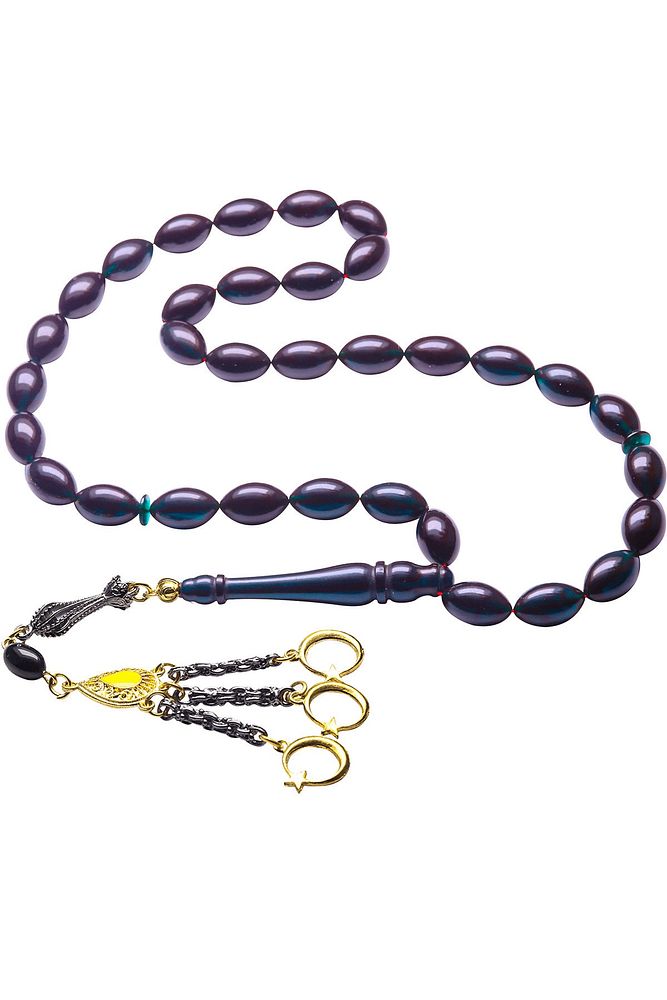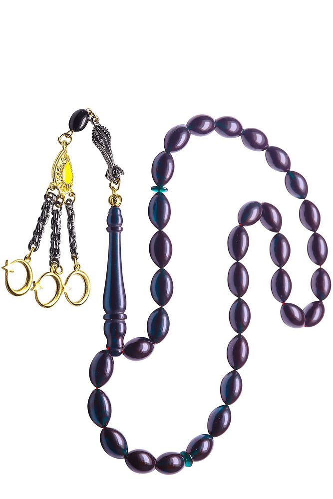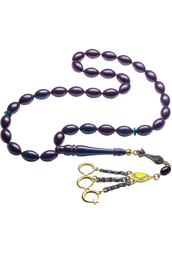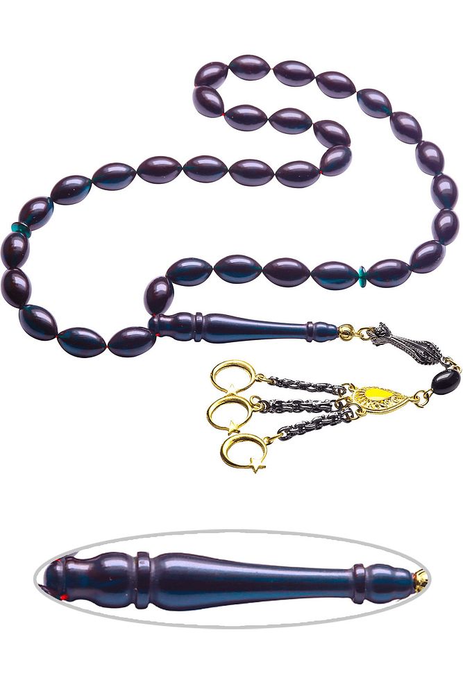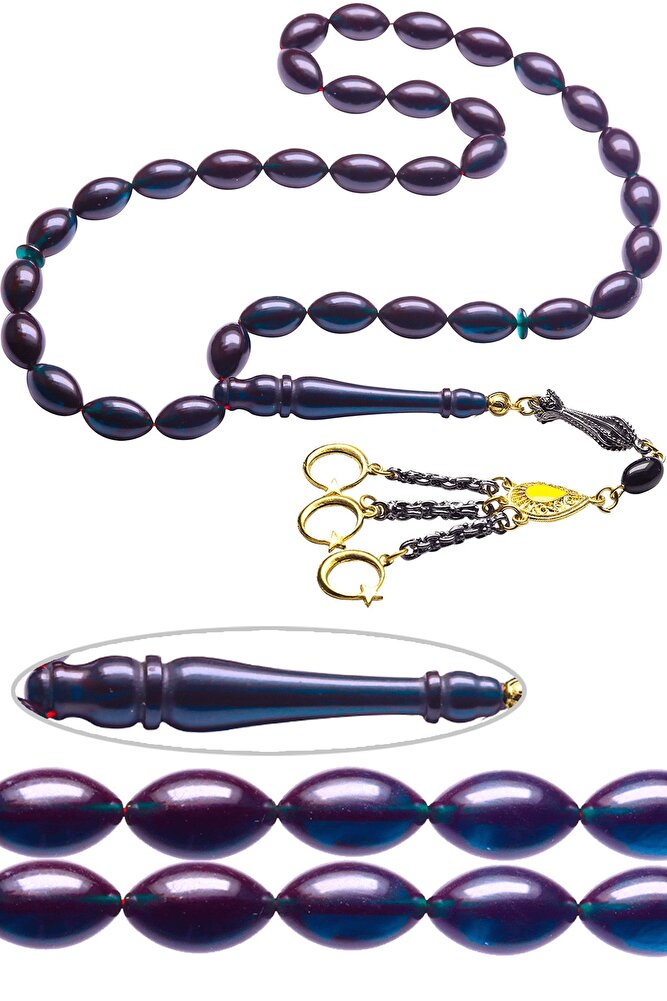 Üçlü Püsküllü Beyzi Kesim Dışı Siyah Içi Mavi Ateş Kehribar Tesbih