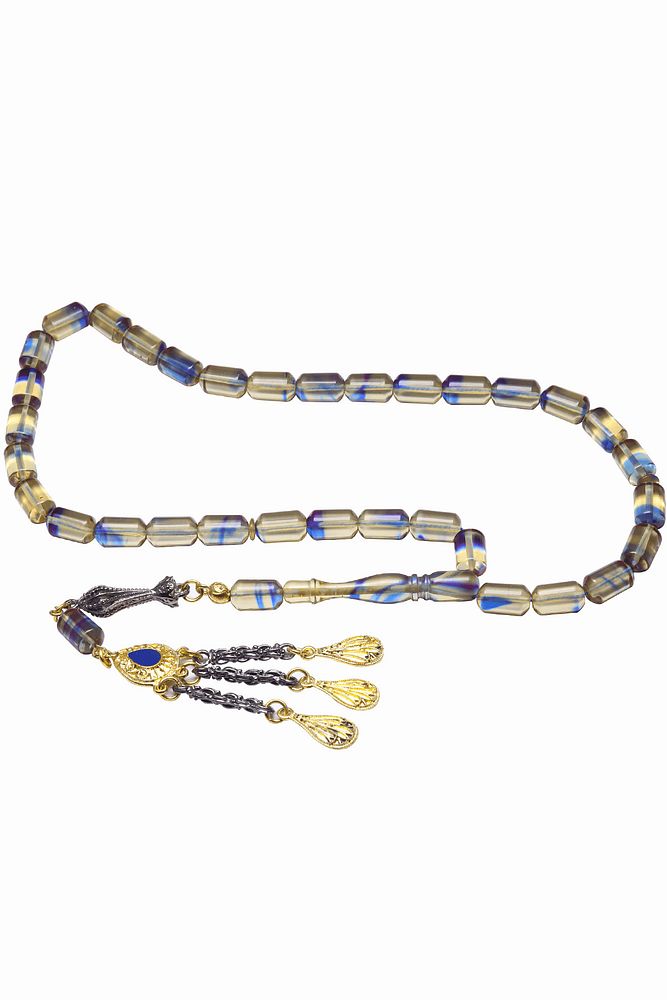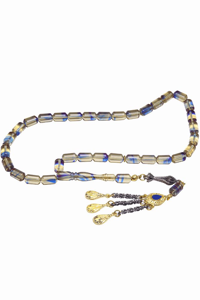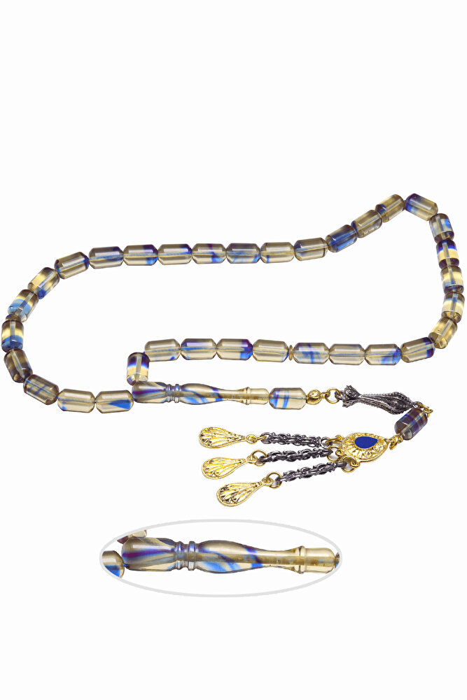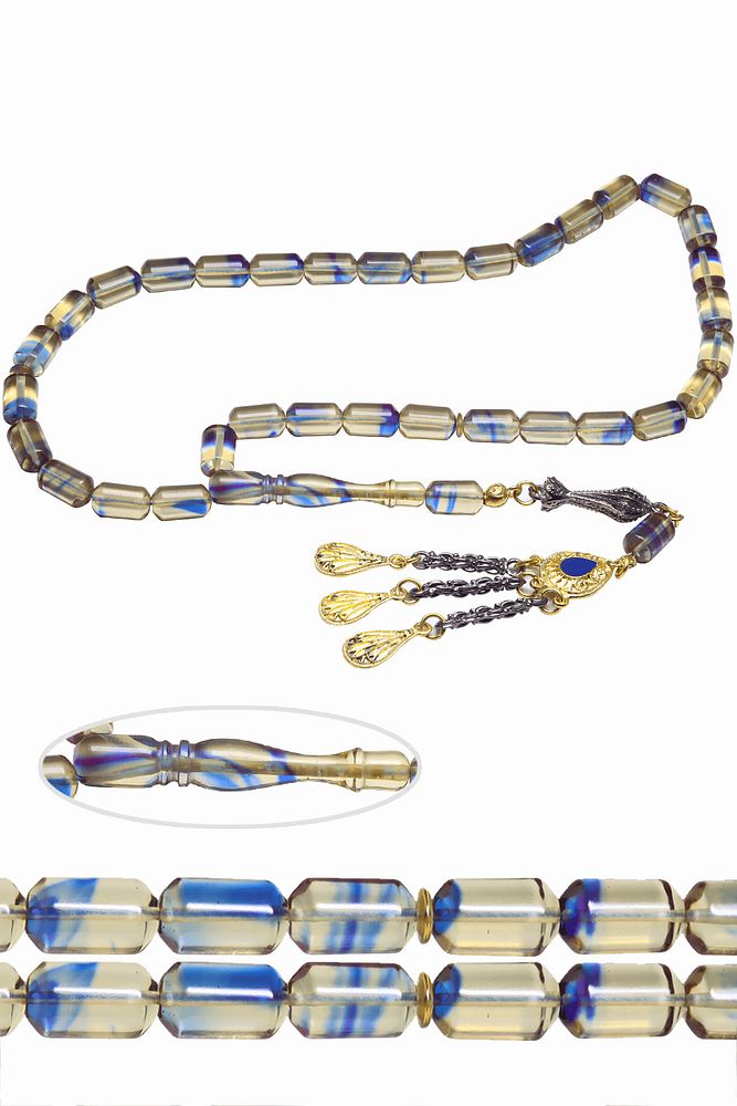 Üçlü Püsküllü Mavi Şeffaf Renkli Kapsül Kesim Ateş Kehribar Tesbih