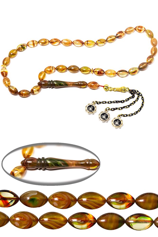 Yeşil Şeffaf Renkli Üçlü Püsküllü Sıkma Kehribar Tesbih